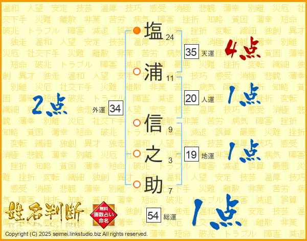 塩(24画)浦(11画) 信(9画)之(3画)助(7画)