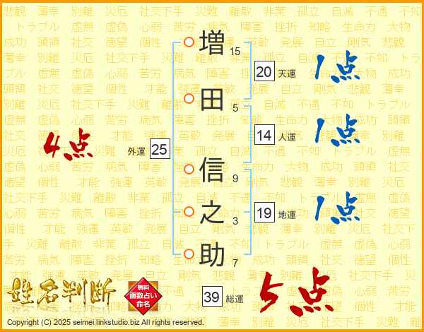 増(15画)田(5画) 信(9画)之(3画)助(7画)