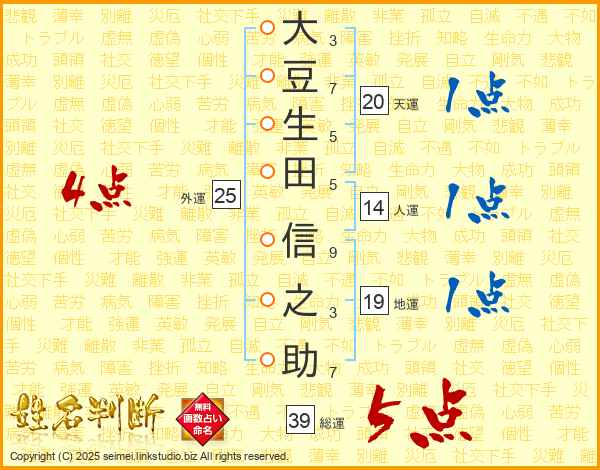 大(3画)豆(7画)生(5画)田(5画) 信(9画)之(3画)助(7画)