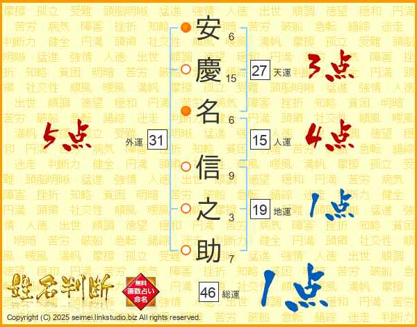 安(6画)慶(15画)名(6画) 信(9画)之(3画)助(7画)