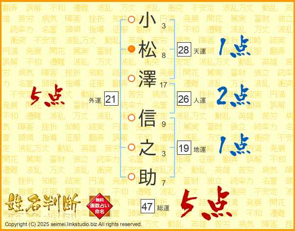 小(3画)松(8画)澤(17画) 信(9画)之(3画)助(7画)