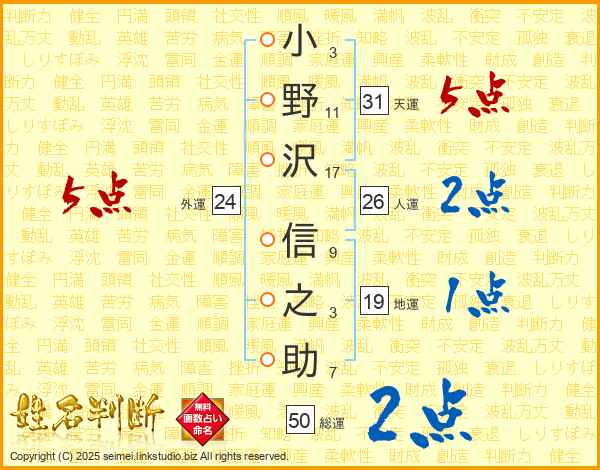 小(3画)野(11画)沢(17画) 信(9画)之(3画)助(7画)
