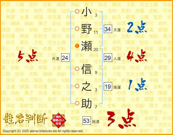 小(3画)野(11画)瀬(20画) 信(9画)之(3画)助(7画)