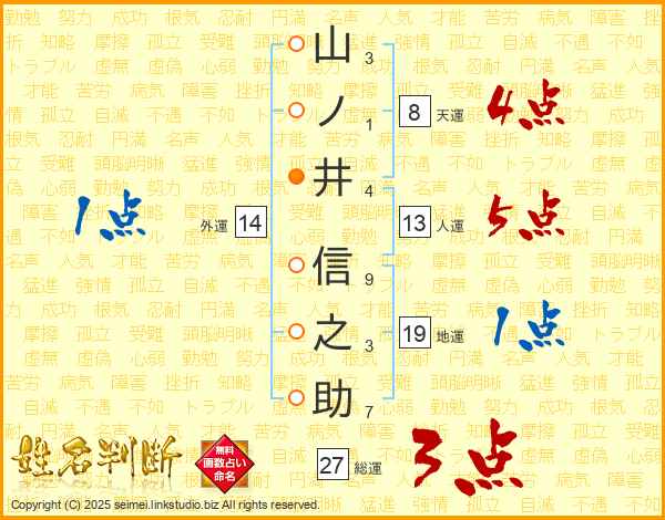 山(3画)ノ(1画)井(4画) 信(9画)之(3画)助(7画)