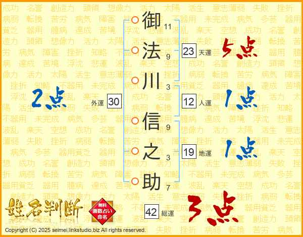 御(11画)法(9画)川(3画) 信(9画)之(3画)助(7画)