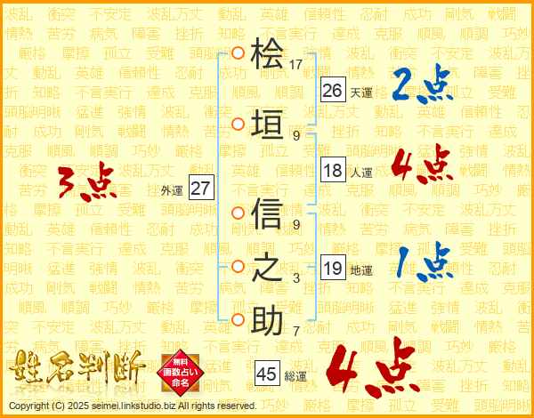 桧(17画)垣(9画) 信(9画)之(3画)助(7画)