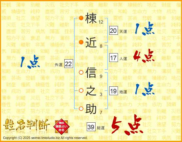 棟(12画)近(8画) 信(9画)之(3画)助(7画)
