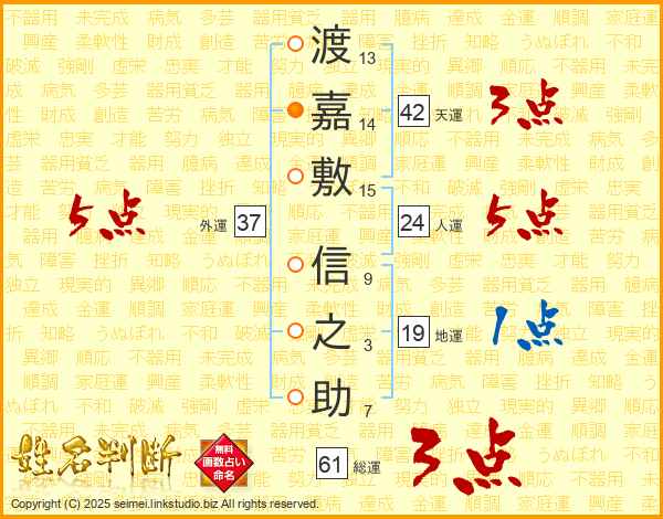 渡(13画)嘉(14画)敷(15画) 信(9画)之(3画)助(7画)