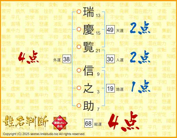 瑞(13画)慶(15画)覧(21画) 信(9画)之(3画)助(7画)