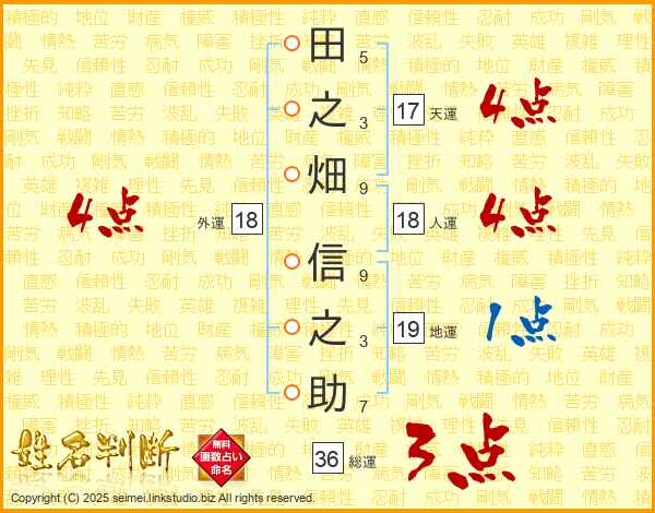 田(5画)之(3画)畑(9画) 信(9画)之(3画)助(7画)