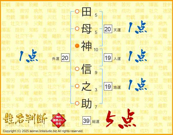 田(5画)母(5画)神(10画) 信(9画)之(3画)助(7画)