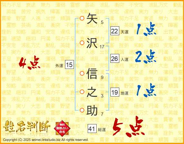 矢(5画)沢(17画) 信(9画)之(3画)助(7画)
