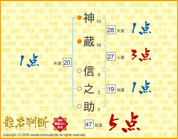 神(10画)蔵(18画) 信(9画)之(3画)助(7画)