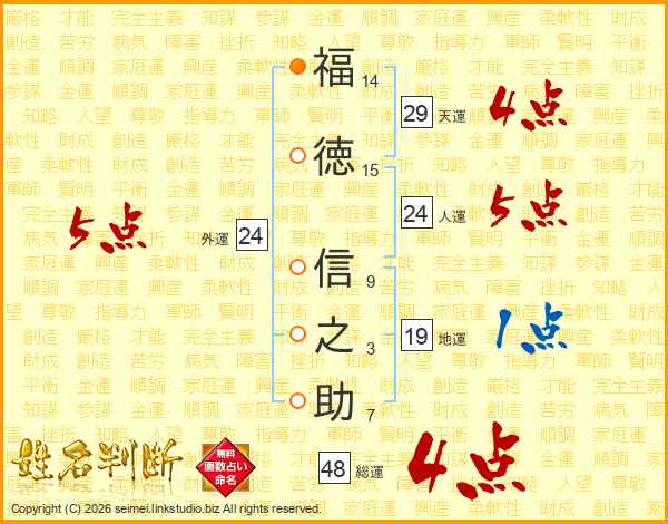 福(14画)徳(15画) 信(9画)之(3画)助(7画)