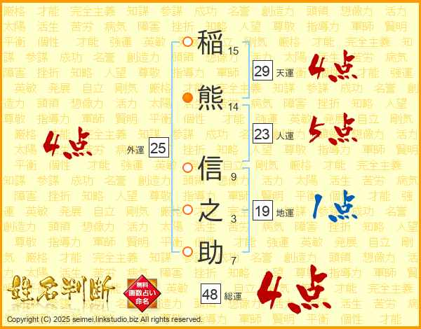 稲(15画)熊(14画) 信(9画)之(3画)助(7画)