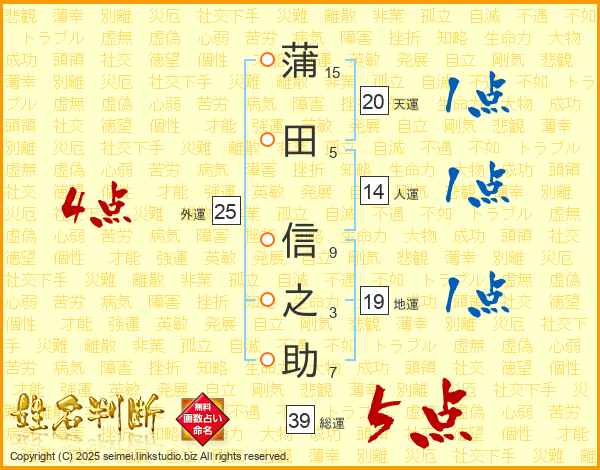 蒲(15画)田(5画) 信(9画)之(3画)助(7画)