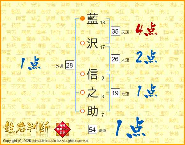 藍(18画)沢(17画) 信(9画)之(3画)助(7画)