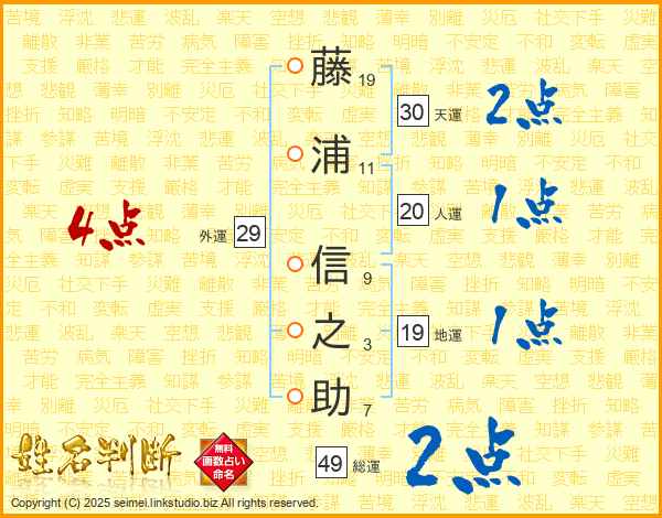 藤(19画)浦(11画) 信(9画)之(3画)助(7画)