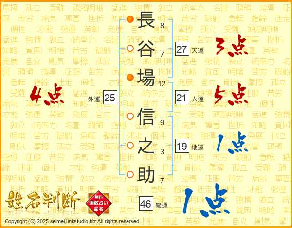 長(8画)谷(7画)場(12画) 信(9画)之(3画)助(7画)