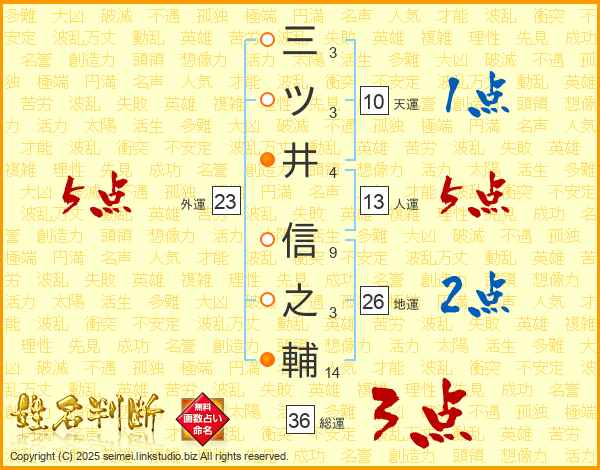 三(3画)ツ(3画)井(4画) 信(9画)之(3画)輔(14画)