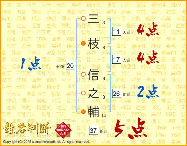 三(3画)枝(8画) 信(9画)之(3画)輔(14画)