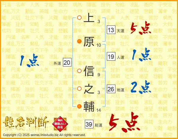 上原信之輔さんの総運は39画の5点!