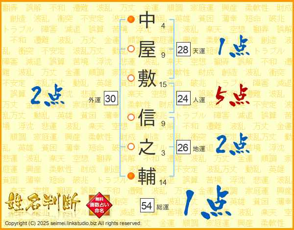 中(4画)屋(9画)敷(15画) 信(9画)之(3画)輔(14画)