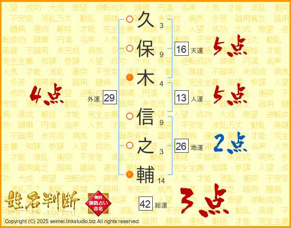 久(3画)保(9画)木(4画) 信(9画)之(3画)輔(14画)