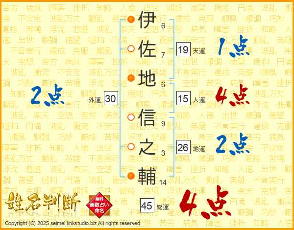 伊(6画)佐(7画)地(6画) 信(9画)之(3画)輔(14画)
