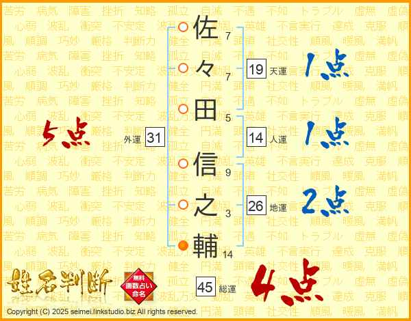 佐(7画)々(7画)田(5画) 信(9画)之(3画)輔(14画)