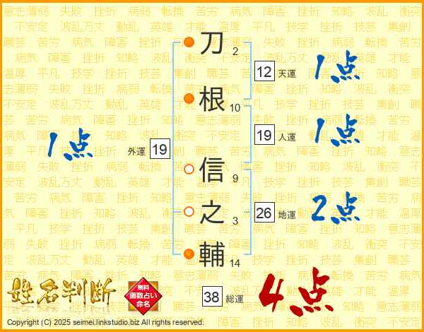 刀(2画)根(10画) 信(9画)之(3画)輔(14画)