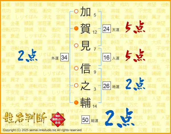 加(5画)賀(12画)見(7画) 信(9画)之(3画)輔(14画)