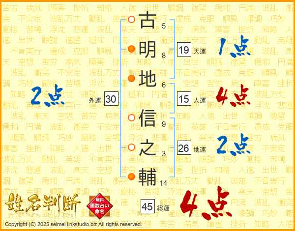古(5画)明(8画)地(6画) 信(9画)之(3画)輔(14画)