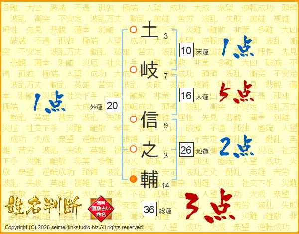 土(3画)岐(7画) 信(9画)之(3画)輔(14画)