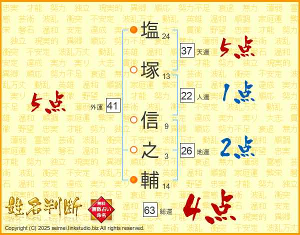 塩(24画)塚(13画) 信(9画)之(3画)輔(14画)