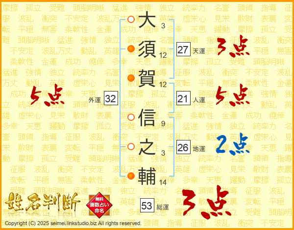 大(3画)須(12画)賀(12画) 信(9画)之(3画)輔(14画)