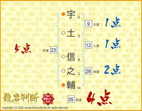 宇(6画)土(3画) 信(9画)之(3画)輔(14画)