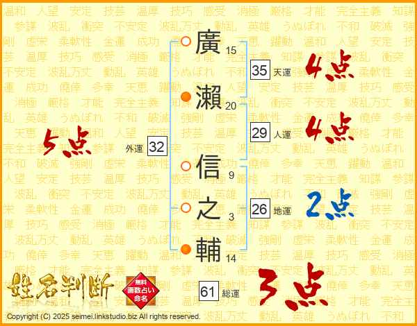 廣(15画)瀨(20画) 信(9画)之(3画)輔(14画)