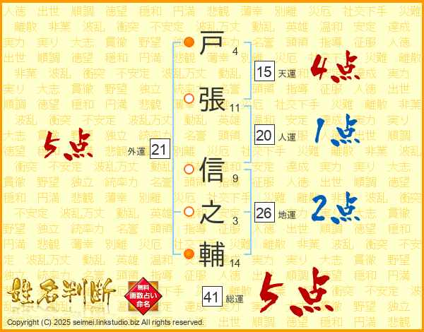 戸(4画)張(11画) 信(9画)之(3画)輔(14画)
