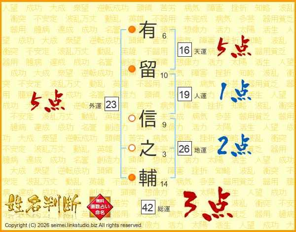 あなたの人生を表す1番重要な運勢です。生涯を通じて影響する総合運となり、主に50歳以降の晩年期に影響を及ぼします。苗字と名前の合計画数。