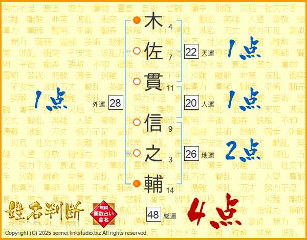 木(4画)佐(7画)貫(11画) 信(9画)之(3画)輔(14画)