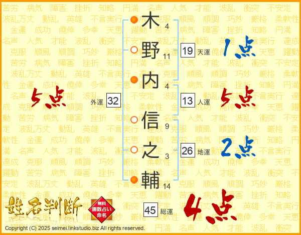 木(4画)野(11画)内(4画) 信(9画)之(3画)輔(14画)