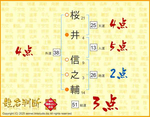 桜(21画)井(4画) 信(9画)之(3画)輔(14画)