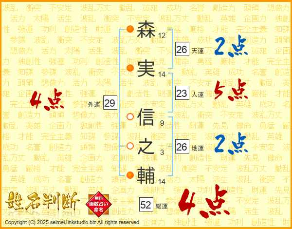 森(12画)実(14画) 信(9画)之(3画)輔(14画)