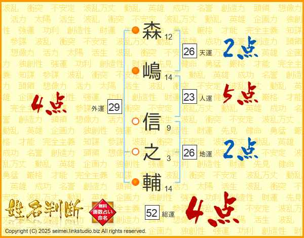 森(12画)嶋(14画) 信(9画)之(3画)輔(14画)