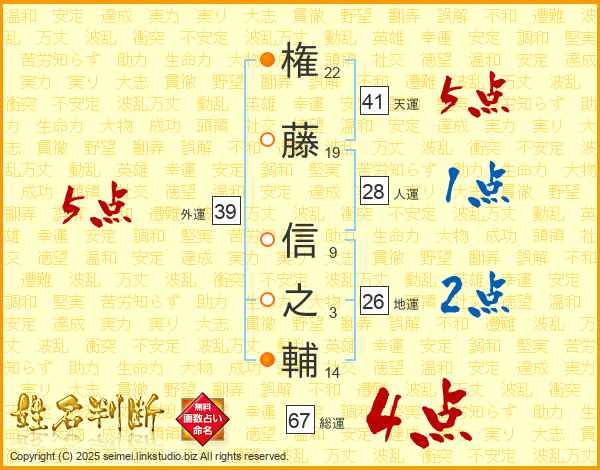 権(22画)藤(19画) 信(9画)之(3画)輔(14画)