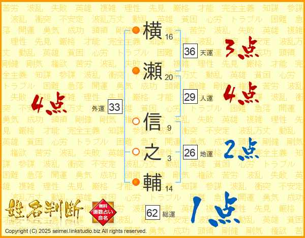 横(16画)瀬(20画) 信(9画)之(3画)輔(14画)