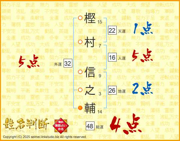 樫(15画)村(7画) 信(9画)之(3画)輔(14画)