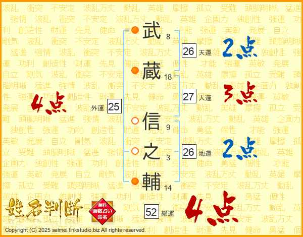 武蔵信之輔さんの総運は52画の4点!