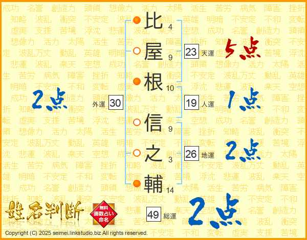 比(4画)屋(9画)根(10画) 信(9画)之(3画)輔(14画)